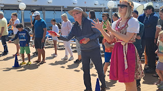 We decided to skip the evening show as it would be a repeat performance for us. We settled down at one of the quieter lounges with lovely piano music playing to settle some scores in our ongoing card game competition. We were just getting into it, when Casper and Avril wandered by and they joined us. We ended up going together to a late night “meet the staff team event” which was loud, noisy and fun. The MC was Italian and his introductions of the staff in his unsteady English left a bit to be desired. It was close to 11pm by the time we headed to our cabins - a bit later than our best before date. Tomorrow is a late docking, so we will sleep in.